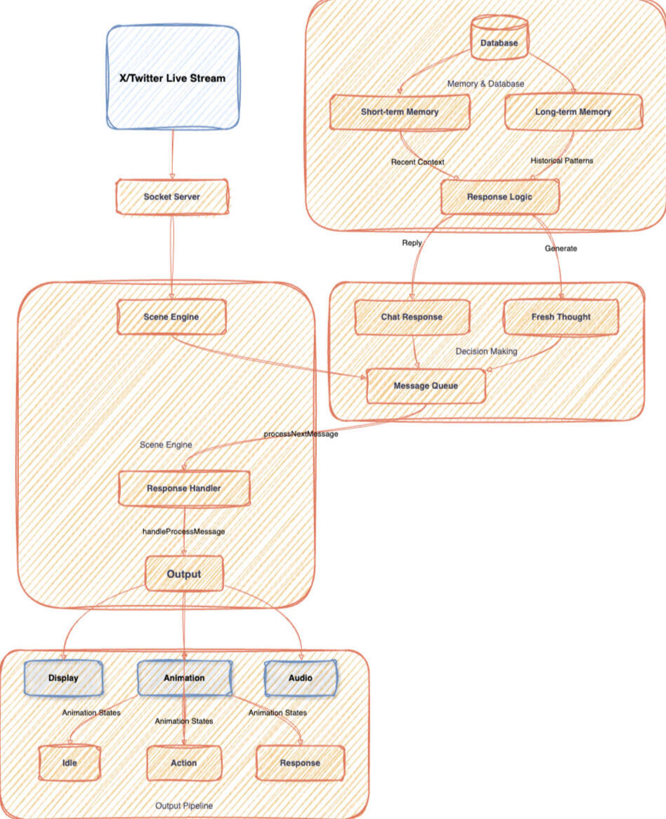 The flow is more straightforward:Twitch → Socket → Queue → Process → RespondEach response can trigger Audio, Animation, and Visual updatesDatabase provides configuration and historyMemory system maintains conversation context